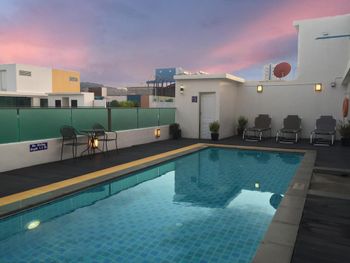 Жил на последнем этаже , и бассейн на крыше был рядом. Окна на горы - тихо, хорошо. .