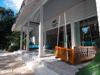 Конкретно мы жили на вилле - отдельный небольшой одноэтажный домик, всю площадь которого занимает большая спальня. Собственный выход к морю в 20 метрах от двери - прикольно. правда, полного уединения нет: соседи слева и справа слышны и на самом деле по берегу ходят все гости. санузел - на открытом воздухе: раковина с зеркалом и туалет с душем под крышей, а еще есть душ в котором вместо лейки этакий слив сверху - совсем под открытым небом. это все прикольно.