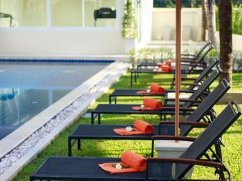 Небольшой отель, с весьма компактной территорией, но хорошо обустроенной. Бассейн небольшой, чистый, с подсоленной водой. В номерах убираются ежедневно, добавляют воду, кофе, сахар и санитарные средства. В зоне завтрака есть микроволновка и кипятильник, в любое время можно разогреть еду, попить растворимый кофе и чай. Если выйти на дорогу, то справа метрах в 700 есть продуктовый магазин 7/11, а слева метрах в 300 - продовольственный рынок с сырой и готовой тайской едой. Такси до аэропорта стоит 250 бат (при заказе через приложение inDrive), дорога заняла минут 15