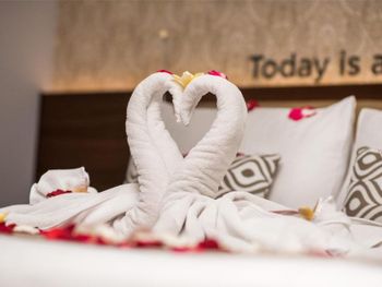 по фото не понятно, что санузел находится прямо в номере за стекляшками, а раковина просто в номере. когда приезжаешь в свадебное путешествие, ожидаешь не это. окна из номера выходят в холл. в номере очень темно 4х звездный отель, а дали всего по 1 полотенцу на человека завтрак шведский стол- еды много, а есть нечего