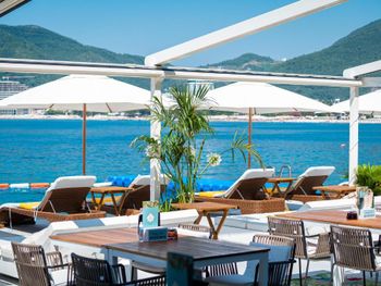 С шезлонгами были проблемы, все забронировано клиентами из апартаментов, пришлось напомнить персоналу на пляже, что клиенты отеля платят в сутки столько сколько клиенты из апартаментов в неделю. После этого как-то зашевелились и нашли свободный. На пляже шум ужасный, найти тихий уголок нереально. Повсюду валяются надувные круги и прочие игрушки. Все сделано для гостей с детьми. Ок, мы не против, но о гостях без детей тоже надо подумать. Пробовали договориться с персоналом отеля о том чтобы принесли пару шезлонгов на закрытый пляж-это бетонная плита, море там глубокое поэтому присутствие детей там исключается. Не договорились. В итоге сами себе все организовали и хотя бы один день смогли провести у моря с книжкой в тишине.