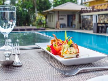 Теплый бассейн. Еда из меню в ресторане вкусная.