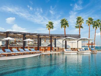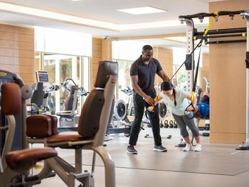 В числе удобств шикарного отеля хорошо освещенные теннисные корты, а также площадки для сквоша и пляжного волейбола. Из фитнес-центра Bay Club открывается вид на бассейн.