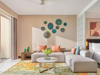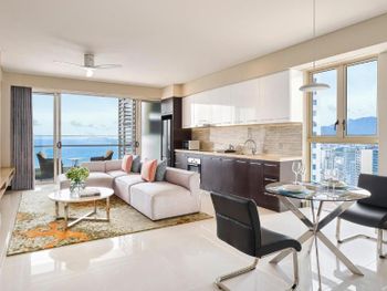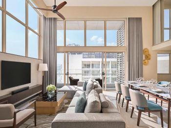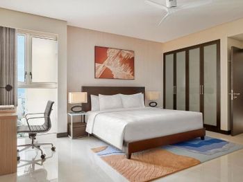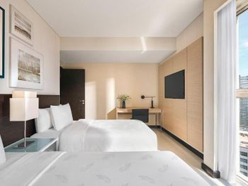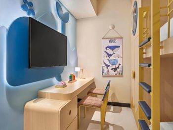 В отеле 29 этажей и только 2 лифта. Сейчас в отеле было мало посетителей, но в сезон, вероятно, дождаться лифта будет сложно. В лифте не работает вентиляция, при этом работает автоматический освежитель воздуха. Каждый раз он срабатывал во время поездки в лифте. Из общих зон кондиционер работает только в холле. В лифте и на этажах кондиционеров нет, на этажах вообще открытые балконы, так что в кондиционер все равно не смог бы охлаждать воздух. На входе в номер холл неправильной формы. В 3 шагах от входа стоит огромная тумба с полочками (ее предназначение осталось загадкой). При этом нет никакой горизонтальной поверхности на входе, чтобы положить сумку, очки, карточку от номера и спокойно разуться, также нет никакого зеркала. Номер просторный, в гостиной и в спальне по кондиционеру. Но кондиционер в спальне при тех же параметрах, что и кондиционер в гостиной значительно хуже охлаждал комнату. В номере есть огромная кухня с холодильником, микроволновкой, чайником, плитой, духовкой. Но на всей рабочей поверхности только 2 розетки и чтобы включить чайник, нужно отодвинуть микроволновку, потому что розетки спрятаны за ней. На всей огромной кухне 4 стакана и 4 кружки. Остальная посуда предоставляется по запросу (так сказали на ресепшене). Когда мы попросили нож и тарелку (чтобы порезать фрукты), принесли столовый нож (которым невозможно адекватно почистить манго или разрезать более твердый фрукт) и глубокую миску. Вообще в непонятных местах расположены розетки и очевидно, что их недостаточно. Например, фен мы обнаружили в шкафу для одежды. Зеркала ни одного в спальне нет. В ванной есть зеркало. Но! Нет ни одной розетки! Также в ванной видимо выпала одна плитки и ее прималазли обратно, но не посчитали нужным удалить лишнюю затирку между швами и помыть. За 4 дня ничего не изменилось.