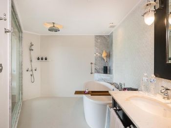 Вдоль пляжной линии довольно много водорослей - их можно задеть при купании плюс из-за этого вода не очень прозрачная, снорклить особенно не получится. От пляжных вилл нельзя напрямую выйти к морю - т.к. все пляжи на Самуи муниципальные, из соображений секьюрити территория вилл отеля находится на возвышении относительно пляжа около двух метров. Тропический душ на улице на вилле не слишком функционален. Но это вряд ли проблема, т.к. душ в помещении совершенно полноценный.