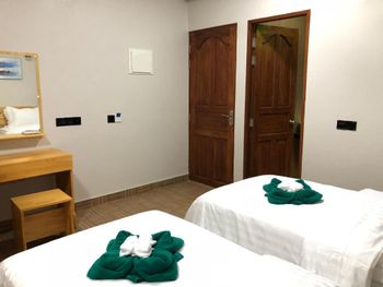 В аэропорту не сразу встретили, час прошёл, потом ждали часа полтора ещё одного пассажира. На обратном пути управляющий отеля сказал что лодка будет стоить 120$, так как лодка пустая и только для нас, но если поедет ещё кто то тогда дешевле, в итоге ехало 6 человек, отдали 100$. Завтрак никакой, все 13 дней-омлет из одного яйца, тост, сосиска одна (не из мяса) масло и джем по 1 шт (самолетные упаковки), яблоко и апельсин, по одному на 2 персоны, чай или кофе, вместо сока Юппи. Пляжа где можно купаться в купальнике нет, вернее он есть, но купаться там не получится, потому что - лодки, мелко( по колено), водоросли.Ходили купаться в неположенном месте, пару дней прокатило потом прибежал местный с тёткой и сказал что пойдет жаловаться в полицию если не уйдем. Кафе на острове 2, и то через неделю одна закрылась. Меню скудное, но голодным не останешься, сок сильно разбавляют водой, чек примерно 20$ на двоих. Я думаю что такой сервис из за отсутствия туристов, а может и наоборот. Так как идёт стройка отель стоит не у моря, там уже насыпали метров 150.Кровать в номере составлена из 2, но это не беда, плохо что обе кровати все время разъезжаются.