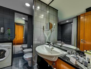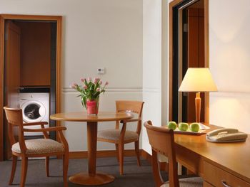 номер прокуренный, была стиральная машина и гладильная доска, но при этом стиралка не работала, а утюга на было вовсе . Мы брали номер, чтобы провести ночь из-за отмены вылета . В ресторан не советую ходить, там даже в салат цезарь входят только листья салата и сухари