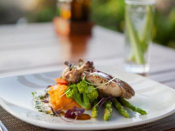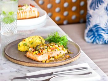 Отель расположен вдалеке от всего, поэтому поесть можно только на его территории , а цены очень высокие! Мы пообедали и поужинали на двоих с одним бокалом вина по цене номера за ночь!