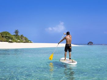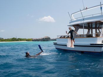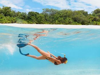 Можно взять бесплатно маски с ластами. С комментариями про то, что рифов вообще нет - я не согласен. Мы жили на Sunset водной вилле и если доплыть до рифа, то рыб там было просто огромное количество, я даже в Египте столько не видел. Видели и акулу рифовую и черепах несколько. Около пантона тоже приятно плавать и есть что посмотреть.