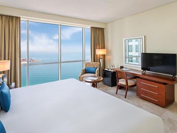 Были в этом отеле второй раз. Первый раз жили в улучшенном номере с кухней (2 спальни) на 31 этаже. В этот раз забронировали такой же номер чуть подешевле и ниже этажами. Нас поселили на 16 этаже (я просила специально, чтобы поселили на самом высоком этаже в этой ценовой категории и мне пошли навстречу). Сразу скажу, что в улучшенном номере свежий ремонт, обычный номер сильно уставший.