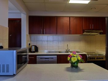 В номере чайник и кухня (микроволновка, большой холодильник, плита, посудомоечная машина). Регулярно обновляют воду и наборы (чай, кофе, сахар). Евророзетки и usb-зарядки есть, но только в одном месте, остальные - для местной вилки.
