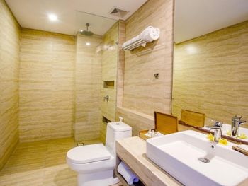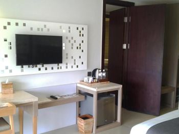Нам достался наверное самый плохой номер в отеле (№135). Отель выбирали для остановки перед вылетом, т.к. был вылет в 9 вечера, оплатили за 2 ночи, чтобы спокойно провести день в отеле, а не на чемоданах в лобби или еще где. Так вот номер за 60$ в сутки был маленький, но чистый. Большое окно на всю стену без возможности его открыть. Когда выбирала номер, разумеется обратила на это внимание, но я надеялась, что кондиционер будет работать исправно. Однако хоть на пульте управления и стояло 18 градусов, он работал как очень слабый вентилятор - просто дул небольшой поток воздуха. У нас есть дайверские компьютеры, измеряющие температуру. Так вот в номере она была +30 градусов. Спать ночью было невыносимо. Разумеется мы сообщили на ресепшен о кондиционере, но проблема не была решена. В ванной вытяжка также работала очень слабо. После принятия душа (а моюсь я в прохладной воде, горячей мы так и не дождались) наша комната просто превратилась в сауну. Развесить мокрые купальники негде, вообще негде (я вешала на ручку двери в ванной). Полотенца также не просыхали (для них были держатели). Одежду пришлось увезти домой мокрой, ранее сухие вещи тоже отсырели - чемодан заметно потяжелел перед вылетом. Чтобы хоть как-то спастись от духоты, мы настежь открыли дверь в номер и так жили. Но окно в номере не открывается, сквозняк устроить невозможно, поэтому ветер с коридорного окна (наш номер был крайний) залетал совсем немного в "прихожую". На кровати было невыносимо душно. В первый наш вечер не смогли попасть на крышу, т.к. она была закрыта на спецобслуживание (какой-то праздник отмечали работники или что-то типа того). В бассейне внизу очень мало лежаков, люди просто складывали полотенца и свои вещи на пол и шли купаться. Номера с балконами имели вид на этот самый бассейн, и наоборот, все в бассейне могли наблюдать за происходящим в номерах на нижних этажах. А с крыши открывается прекрасный вид на остальные номера (в т.ч. на ванны на балконах).