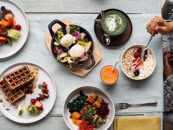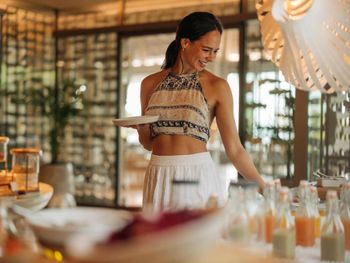 Гостям подают завтрак «шведский стол», завтрак по меню или континентальный завтрак. При JOALI BEING работает ресторан, где подают блюда американской кухни, блюда британской кухни и блюда индийской кухни. Гости могут попросить приготовить вегетарианские, безлактозные и халяльные блюда.