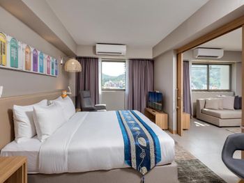 Отель хорош,чисто, тихо, красиво, прикольный бассейн на крыше, полотенце для пляжа или бассейна есть,народу мало,завтраки без мяса,что меня устроило,очень приветливый и готовый помочь персонал,все без исключения. Тапки,всё для душа в номере, отличный напор и температура воды,каждый день приносили по две бутылки воды, в тренажёрном зале стоит кулер,зал кстати тоже отличный, есть на чем и где потренить.Заселили гораздо раньше 14.00 тоже приятно, не пришлось 4 часа ждать на ресепшен.Есть небольшой холодильник,чайник, заварка,кофе.И самое главное ,я жила со своей собакой и рядом есть пустырь для выгула.Всём этот отель рекомендую.