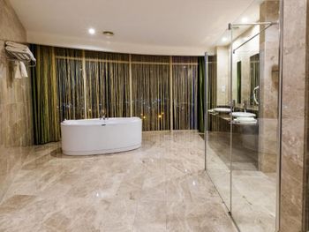 Большой номер. Особое внимание на ванную комнату, огромная, у окна ванная с джакузи, как отдельная атракция. Хорошие завтраки. Большой бассейн с приятной водой