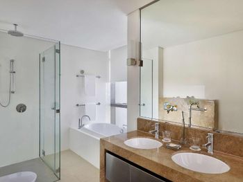 Нет бесплатного спа (даже парилки) - все за деньги. Странная система рассадки в ресторане rosewater - семью с ребёнком садят за двухместный столик, одного человека - за четырёхместный. Те кто понаглее садятся где хотят, не слушая комментариев официантов. Официанты ресторана бегают взмыленные, ничего не успевают - грязные тарелки переставляли сами на соседний стол, на просьбы о доп. Сашке кофе и чистых приборах реагируют очень долго. Пляж небольшой, не очень чистый, с лежаками проблема, как писали ранее, бассейны посредственные. В номере звук от телевизора воспроизводится в туалете , довольно громко, среди множества кнопочек отыскали кнопки регулирующие громкость - эффекта ноль. Решили проблему выключенным телевизором. На территории отеля пройтись особо негде, в Emirates Palace через дорогу не пустили сославшись на неподобающий вид - в шортах, мол, нельзя. В ста метрах от нас, уже на территории отеля, люди спокойно ходили в шортах... Не понятно.