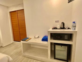 Совершенно нет места для вещей в номере (полки). Есть шкаф для одежды, которую вешать. Там 4 вешалки и все. Размеры номера позволяют, нет понимания, почему так организовано. Персонал не слишком гибкий. Как пример: при выселении в 12, и трансфере в 17 мы с боем добывали полотенца для пляжа, это было очень сложно. Также в прачечной испортили нижнее белье. Постирали белое белье вместе с темно-серыми штанами, в результате белье далеко от белого цвета теперь.