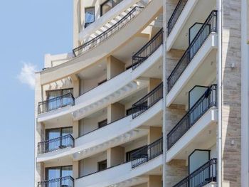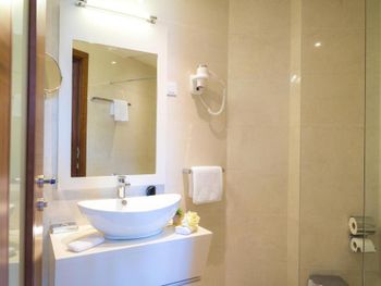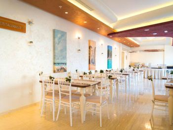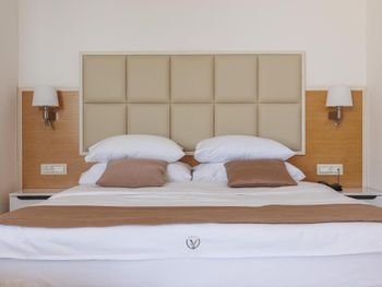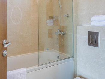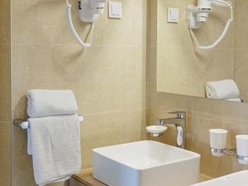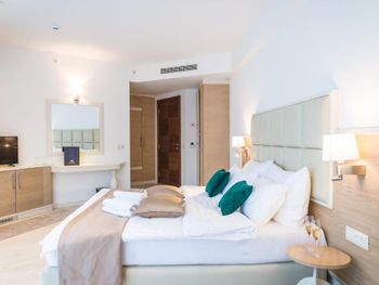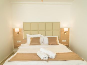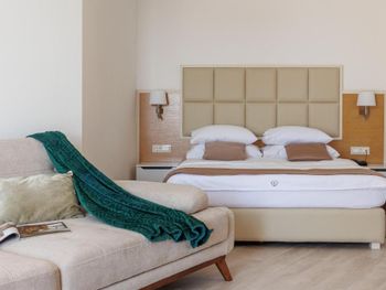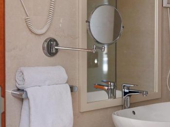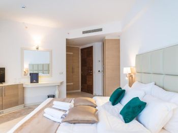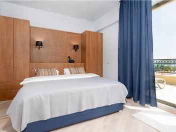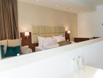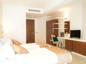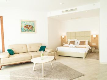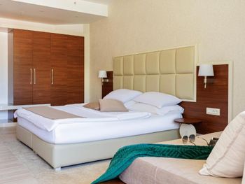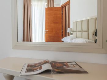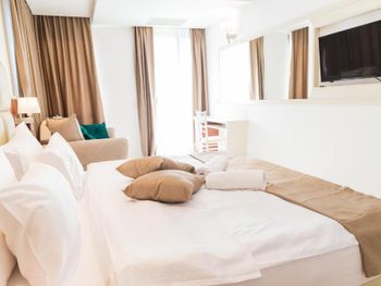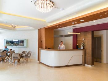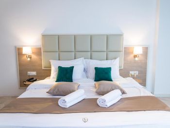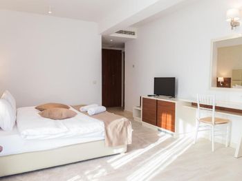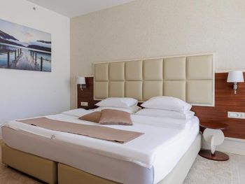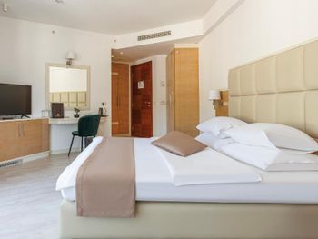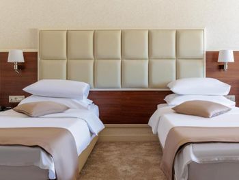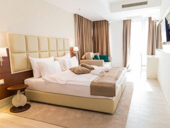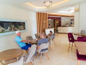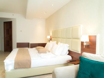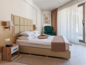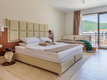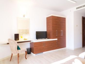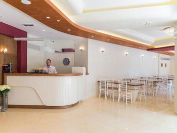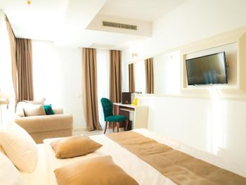 Хороший большой номер на предпоследнем этаже с большим балконом,но с очень,очень маленьким видом на море( хотя было заявлено,что есть вид на море). Реально- вид был только в одном углу балкона,если выглянуть и встать на цыпочки ( у меня рост меньше 1,6 метра. В номере не работал стационарный фен в ванне. Нам,после просьбы,принесли простой переносной. Но назавтра попросили его обратно,для другого номера. Это не критично,но не подобающе для гостиницы с 4 звездами- как минимум в двух номерах нет работающего фена? На мой взгляд гостиница находится далековато от моря,хотя есть и плюс в этом- тихо по ночам,т.к.она находится вдали от набережной с ее дискотеками. И еще- бассейн гостиницы находится не на крыше,а прямо на одном уровне с лобби и напротив входа. Не каждый будет чуствовать себя комфортно в купальнике в шезлонге напротив входа в лобби и ресторанчика гостиницы.