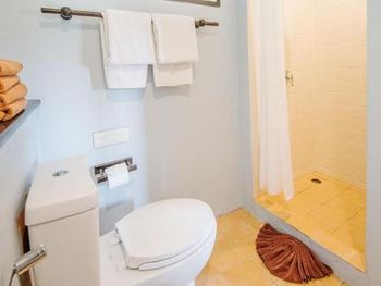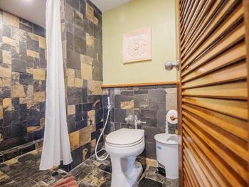 Ящерицы везде. Темно. Плохое освещение. Сгоревшие лампочки. Долго нагревается вода в душе. Санузла нет. Душ отгорожен шторкой, мешает спать звук воды тем, кто еще спит. Раковина прямо в комнате. Завтраки нормальные