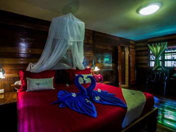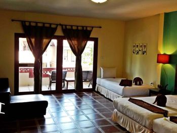 На первый взгляд отель нормальный, да и цена у него не низкая... НО! Это только видимость..Во-первых в комнатах запах прелости и грибка! А кондиционеры старые и не чищенные - дуют прям на кровать. Воздух от них затхлый и холодный, мы простыли от него... во-вторых на входных дверях огромные щели! И это с учётом того, что на территории расположены грязные пруды, более похожие на болота, которые привлекают комаров... и самое ужасное это грязное постельное белье! Серое с жёлтыми пятнами! Мы пожаловались на это и попросили заменить.. В итоге, заменили грязное на грязное... мы не могли дождаться когда выедем из этого отеля. Сейфа в номере тоже нет!