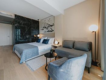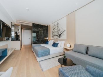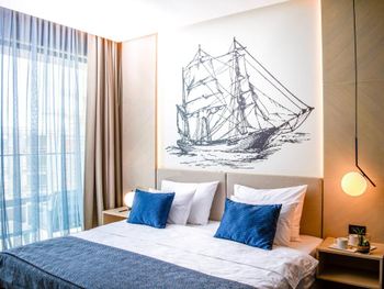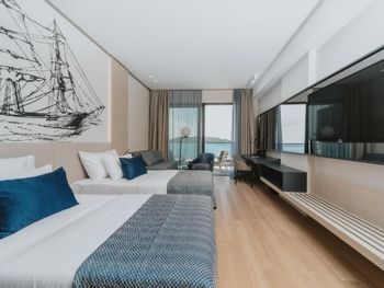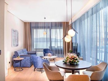 Новый отель 4 звезды.Большой,современный номер со всем необходимым. Большая лоджия. На ресепшен девушка заселила нас в номер с видом на море,хотя мы дополнительно за это не платили при бронировании. Достойный шведский стол. Уборка номеров и замена полотенец каждый день. Бассейн на крыше,у ресторана и в спа.