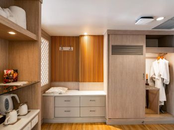 Мы останавливались в номере Гранд, разделенном на две зоны, чтобы наш ребенок спал в другом помещении - это один из дорогих номеров отеля. Планировка номера выполнена с помощью фанерных перегородок и шаттерсов (двери- жалюзи), санузел расположен буквально в шкафу и не имеет никакой звукоизоляции и отдельной принудительной вентиляции в нем тоже нет - это просто отвратительно! Отделка номера выполнена в традиционном стиле, но пришла в негодность и много чего в номере покрашено масляной краской - это очень бедно выглядит, а, напомню, отель не дешевый. Да и все материалы отделки номера выглядят удручающе: что не покрашено, то поцарапано, кондиционер шумный, не регулируется и источает при работе неприятный запах, из санузла воняет канализация, матрас к утру проминался практически как гамак ( мой вес 64кг), подушки неудобные - в общем, полное разочарование.