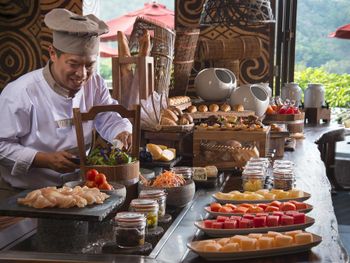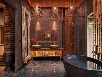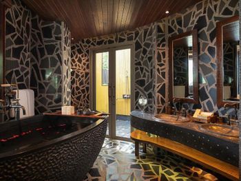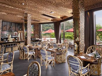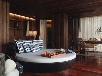 Заказали пиццу с пармской ветчиной, в ветчине оказались такие жёсткие жилы, которые невозможно было проживать и проглотить. Позвали менеджера - менеджер сказала, что это пармская ветчина в тайском стиле. Решили больше не рисковать заказывать еду. Вообще неудобное меню на айпаде - искать по pdf файлам нужные блюда долго, да и хочется отдохнуть от гаджетов в таком отеле. Нет разнообразия десертов, нет выбора десертов без сахара и для веганов. В номере не было никакой акустики, для атмосферы не хватает музыкального фона. Не было аромосвечей. В баре не было снэков, с учетом, что отель далеко от магазинов, можно было предусмотреть. Цена кратно превышает качество сервиса, но все равно понравилось.