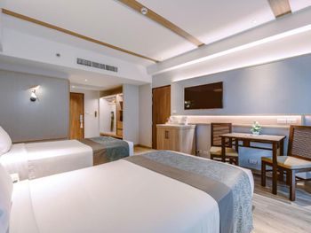 Отель не новый, оснащен техникой (кнопками около кровати) периода 80-90е годы. Все немного потрепанное, в комнате была закрытая дверь в соседнюю комнату. Слышимость хорошая... Не 5 звезд и не 4. До моря по переходам отеля идти было 10 минут. Территория зеленая, но в нашу комнату путь пролегал вдоль забора. Мы люди не требовательные, простые. Все бы ничего, но не за 400 евро/день!