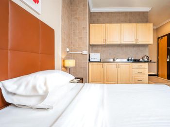Заселились в этот отель на несколько часов до вылета. На ресепшене пришлось подождать пока подготовят номер, хотя заселялись после 15.00. Номер был отличный, с отдельной спальней и гостиной-кухней. Был чайник с набором чая-кофе-сливок и бумажные стаканчики, маленький холодильник и 2 бутылки с питьевой водой. Единственный минус-это страшный шум с улицы, т.к. прямо перед отелем идет стройка. Сложилось впечатление, что живешь прямо на стройке. С наступлением темноты все затихло, но очень слышно ЧТО происходит в коридоре. Т.е. шумоизоляция никакая. Говорят, что в отеле есть бассейн и сауна, но мы там не были. В целом рекомендую этот отель, но только после окончания стройки. Расположение очень хорошее, все в шаговой доступности.