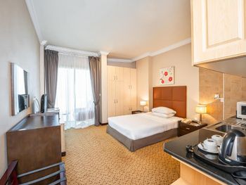 Отличный новый отель в очень удобном месте в двух кварталах от Сук Вакиф, близко к метро, удобно добираться из аэропорта. В номере были чайник, холодильник и плита.