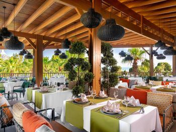 Ассортимент блюд в ресторане и качество выше всяких похвал. На входе гастрономические блюда, сладкий стол и качество мороженого на высоком уровне. Свежевыжатый апельсиновый сок в графинах. Обслуживание дружелюбное. Мы отдыхали в конце октября, было много туристов из Германии, Голландии, Польши, Бельгии, из РФ мало. Отель на 5+. На следующий день после заезда привезли в номер тарелку с фруктами и бутылочку вина.