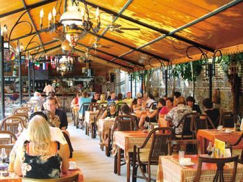 Минусов гораздо больше и они не перекрывают плюсы! Интересное фойе, обставленное предметами старинной утвари, на него-то я и купилась. В пешей доступности пляж Клеопатра – самый лучший пляж Алании, не тратьте времени – купайтесь только на нём, с другой стороны горЫ пляжи хуже. Вода в октябре (с 20-го по 30-е) была очень тёплой и чистой. Ездили ради разнообразия в Сиде, там вода холоднее и загорающие «топлесс» немки, в Алании я не видела такого безобразия. В пешей доступности центр города. Мы часто ходили пешком различными способами: по променаду вдоль моря, по улице, заглядывая в сувенирные магазинчики, и даже босиком по кромке воды. Поэтому сами, без всяких экскурсий посетили пещеру Дамлаташ, на канатной дороге поднялись к крепости, всё без спешки осмотрели, спустились пешком с обратной стороны горЫ по жилым интересным улочкам. Назад всегда возвращались автобусом, остановка рядом с отелем. Рядом также находится супермаркет Мигрос, его видно из окон, там мы часто покупали вино, оливки и пахлаву, так как питаться в отеле оказалось невозможно. Это был наш ужин на балконе. Балконы, кстати, хорошие, большие, с видом на бассейн, а с нашего ещё и огни крепости было видно. В номере есть бокалы. Правда в трёхместном номере их было два)). Рядом есть общественная бесплатная парковка, оставляли там арендованный автомобиль. Рядом находятся два банкомата Денизбанка, в которых можно снять по карте Сбербанка наличные сразу в лирах, русское меню, один банкомат рядом с Мигросом, а второй – около точки такси, по пути к пляжу. Рядом есть две аптеки. Вкусный чай в столовой.