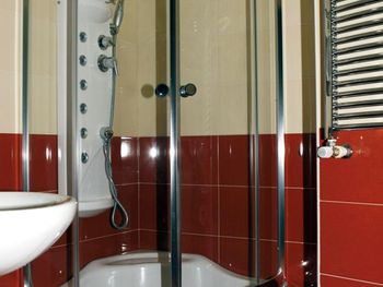 Номер со старым ремонтом, очень маленький санузел тоже с давно устаревшим ремонтом, следы протечек