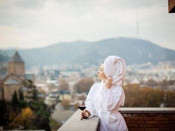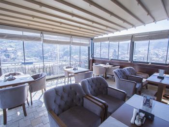 Вид на город и горы в первом корпусе на 5 этаже, где проходит завтрак.