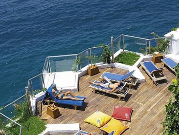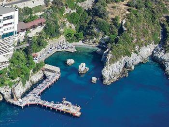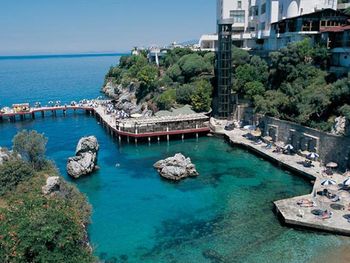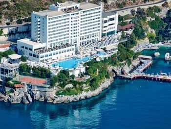 Из отеля Korumar открывается потрясающий вид на Голубиный остров. Этот 5-звездочный отель расположен на скале в Эгейском море. К услугам гостей 2 частных пляжа, 2 бассейна и большой спа-центр.
