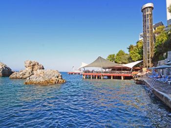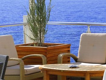 Замечательный отель. Да, немного несовременный дизайн, но везде чисто, персонал дружелюбный, очень стараются. Мы с семьей снимали 2 номера: один с видом на море, второй с видом на горы. Обязательно надо брать номер с видом на море. Вид из номера потрясающий (см.фото)! Питание хорошее, ужины с видом на закат незабываемые. Вода в море чистейшая, вход в море с платформ (по лесенке или можно сразу прыгнуть), есть маленький каменистый пляж, лежаков много и на пляже, и у бассейна, всегда есть свободные.