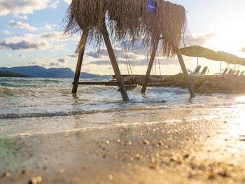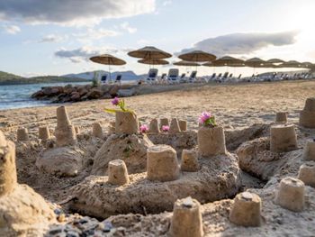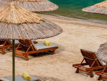 Песок желтый и не мягкий. Некоторые кровати на пляже требуют ремонта. Машинки от пляжа очень редко ездили- приходилось пешком подниматься в гору.