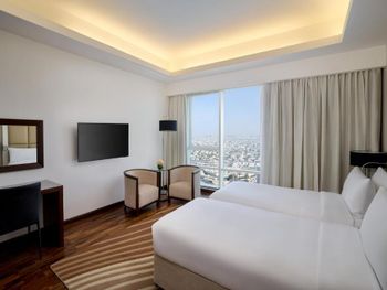 Был номер с видом на город. Напротив стройка двух высоток. Сами ремонтные работы не слышно, как и магистраль на Абу Даби ( очень хорошая шумо изоляция), но вид из окна немного подпортил.