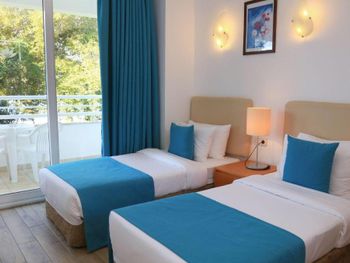 Хороший отель, зелёная территория, чистое и теплое море. Пляж тоже чистый, лежаков много. Дно в море каменистое, но если есть тапочки для плавания, то все отлично. Вход в море с резким перепадом, для маленьких детей не подходит. На пляже и в море не так много людей, иногда мне казалось что в море плавает только наша семья)).На территории много котиков. Вечерние программы были интересные. Персонал весь приятный и улыбчивый, официанты общительные и доброжелательные, работают с полной отдачей. Убирали в комнате каждый день, так же каждый день меняли постельное и полотенца, номера чистые, без запаха, все работало. Кондиционеры спасали от жары. Кровати удобные.