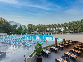 Приехали не на тот корпус, но отель быстро организовал шаттл до главного здания — красивый фасад, яркая вывеска, уютный холл и welcome-зона с прохладительными напитками. Территория зелёная и ухоженная: высокие пальмы, подстриженный газон, тенистые зоны с гамаками и местами для отдыха. Вечерами — шоу-программы, лазерные представления, приятная атмосфера. У бассейнов проходили интересные интерактивы и анимация (для возрастов 16+). Хороший аквапарк с горками — подойдёт как детям, так и взрослым. От центрального корпуса до моря — около 10 минут пешком. На пляже работает бар с напитками и закусками. Море красивое и чистое изумрудного цвета. Питание разнообразное: ежедневно рыба (дорада, сибас), мясо, гриль, вкусный чечевичный суп. Фрукты — арбуз, дыня, груши, яблоки, апельсины, сливы. Алкогольные и безалкогольные коктейли, вкусное пиво и вино. В течение дня и вечером — мороженое (ванильное, карамельное, шоколадное, фисташковое). Регулярно проводилась уборка номера.