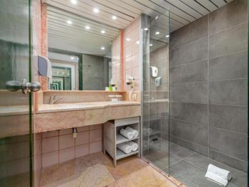1. Бутилированной воды в открытом доступе нет. Ее надо просить у бармена. Он выдаёт весьма скупо ))) по 1 бутылочке 0,33 л на нос. Если хорошо попросишь — даст вторую. То есть, если у вас большая семья и вы послали кого-то одного взять всем по бутылочке воды, клянчить придётся долго )) 2. С мыльными средствами бедненько. Жидкое мыло в диспенсере над раковиной и гель/шампунь (одно средство) в диспенсере в душевой кабине. Отдельного шампуня нет, а кондиционера для волос и подавно. Нет шапочек для душа. 3. Розеток в номере действительно мало. Спасибо умным людям, которые посоветовали привезти свои удлинители. 4. На флагштоке отеля нет российского флага.