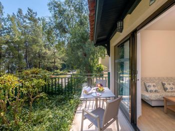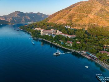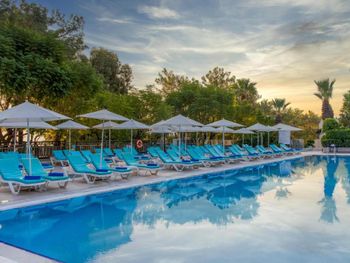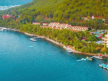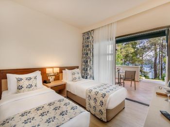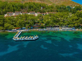 Середина - конец сентября 2021. Ездили самостоятельно. Трансфер заказывал такси через Booking. Все четко. Встреча в аэропорту и в отеле. От аэропорта Даламана до отеля 1,5 часа в пути, дороги свободны. Отель заполнен полностью, 90 % русскоговорящие из них приблизительно 50% с Украины. Расположен в 4 км. от городка Ичмелер и в другую сторону 5 км. до центра Мармариса. Спокойное красивое место для тихого семейного отдыха. По берегу моря сосновые леса, правда за отелем лес на горах горел, но это видно только с моря, когда плаваешь. В отеле главный корпус и бунгало. Мы бронировали бунгало, они расположены террасами двумя линиями по 2-3 уровня и разделены тремя дорожками. От нижней дорожки до верхней - 62 ступени. Если смотреть с моря , то сначала пляж. Бетонная плита . выложенная камнем. Есть две бухточки по 5 метров где плещутся детишки, несколько лестниц для спуска в воду, туалет и переодевалки. Сразу за пляжем живая изгородь и променад (пешеходная и вело дорожки) соединяющий отели от Ичмелера и Мармариса. От променада вверх – ограждение территории отеля и высокий косогор с соснами и кустами вплоть до нижней дорожки бунгало. Раньше было две тропинки от бунгало до пляжа, но они закрыты из-за COVID, так что на пляж надо идти через главный корпус. Сразу за бунгало – автодорога она на несколько метров выше крыш верхнего ряда бунгало. На верхних этажах второй линии ее немного слышно, но это не напрягает. Оптимально брать бунгало на семью из 4-х человек, т. к. оно разделено на две части, которые можно объединить. На двоих половинка – нормально , но с ребенком – тесновато. Вообще территория зеленая, чистая, ухоженная.