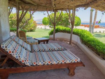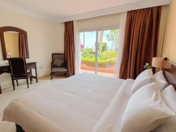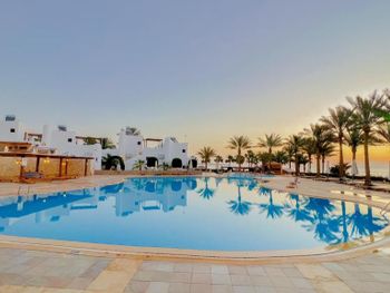 Не ожидайте от отеля уровня пяти звезд. Постельное белье, полотенца, старые - это основной минус. Архитектура типа "египетский город" подразумевает что номера "garden view" не имеют балконов и окно выходит не на улицу, а в закрытую лаундж-комнату. Мы поменяли номер на "sea view" за 10 евро/день - второй этаж со своей террасой, окно на море - отлично. Кухня: повара стараются, голодными не останетесь, но набор блюд обычно не велик. Пляж: основной понтон затоплен водой, скользкий. Возьмите коралловые тапочки и веревочку (прищепку), чтобы привязать тапочки на конце пирса. Комары. Если хотите вечером посидеть на улице - запаситесь спиральками.
