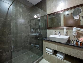 В номере джуниор очень маленькая душевая кабина, двери кабинки плотно не закрываются и естественно вся вода оказывается вне кабинки.