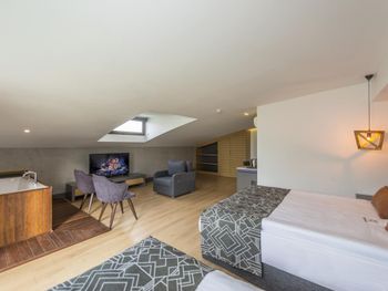 Хорошее расположение. Есть где прогуляться, рядом водопад. Современный интерьер номера