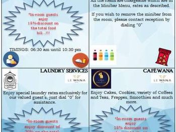 В номерах в Le Wana Hotel установлен кондиционер, телевизор с плоским экраном и сейф. Среди прочих удобств — письменный стол, чайник и мини-бар, а также собственная ванная комната с душем. В собственной ванной комнате есть бесплатные туалетно-косметические принадлежности. Гостям Le Wana Hotel предоставляются постельное белье и полотенца.