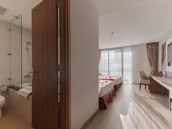 Бесплатно сделали апгрейд рума и выделили самый хороший номер в 65 квадратов! Отель новый, номер потрясающе большой. Ощущение будто находишься дома! Очень уютно было. Отличный вид на город и море. Сплит-система отлично поддерживала комфортную температуру. Хорошие матрас и подушки. Удобное расположение. На районе достаточно тихо. Прохладный бассейн компенсируется неплохой сауной, правда щель в двери не даёт хорошо ее разогреть. Рекомендую брать самый большой номер! Он стоит всех 5 звёзд!