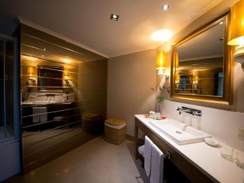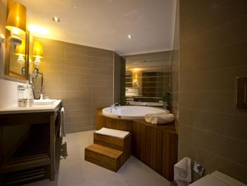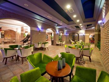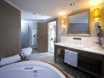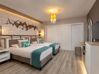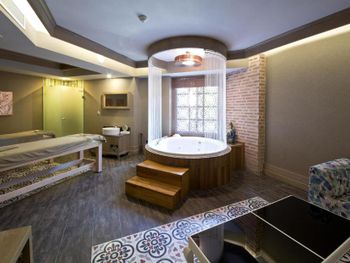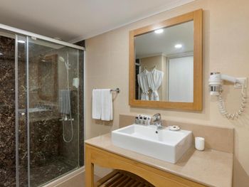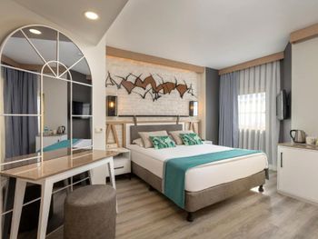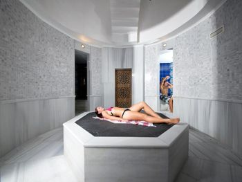 Specially constructed, the outdoor swimming pool is decorated in the shape Pamukkale Travertines and the other pools feature water slides. The hotel spa includes a Turkish bath and a sauna. Football field and a fitness centre are also available for sports-minded guests.