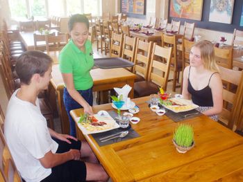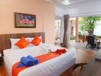 Новый чистый отель. Проживали в бунгало №1 (семейный), прямо перед бассейном. Номер, как и весь отель, свежий, приятный. Заселились быстро, на ресепшн оставили паспорта как залог. В номере ежедневная уборка, достаточно качественная. Завтраки нормальные, выбор не очень большой, но достаточный, чтобы каждый день выбрать что-то для себя. Детям не очень нравились завтраки, поэтому спасала каша, привезенная из дома. Персонал доброжелательный, отзывчивый. В отеле можно поменять деньги (курс не очень), взять напрокат байк, воспользоваться услугами прачечной и т.д. Бассейн небольшой, есть джакузи (работает не весь день, по какому принципу включают - не понял). Бассейн чистят, но не всегда качественно (остается песок, взвесь). Рядом кафе/рестораны, фруктовый рынок.