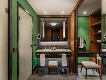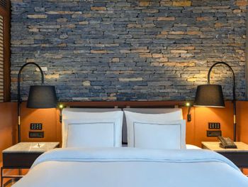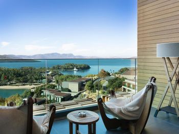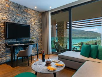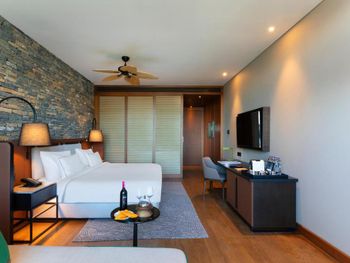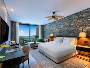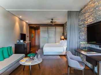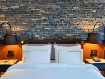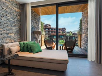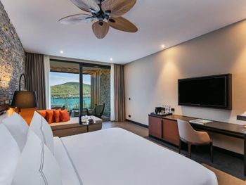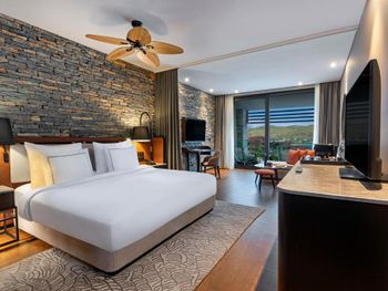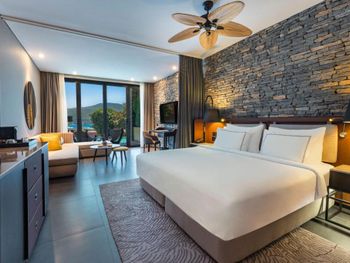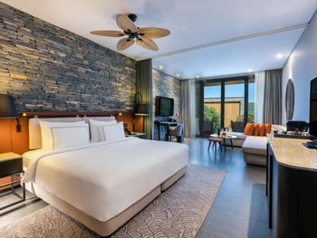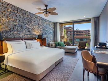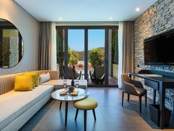 All rooms and suites are elegantly designed and include private balconies or terraces, modern interiors, and premium amenities. Selected villas, nestled among natural rock formations, offer private pools and gardens for an elevated sense of privacy and luxury. Each accommodation features air conditioning, a flat-screen TV with satellite channels, a walk-in wardrobe or seating area in select rooms, and a stylish bathroom equipped with double sinks, bathrobes, slippers, and luxury toiletries.